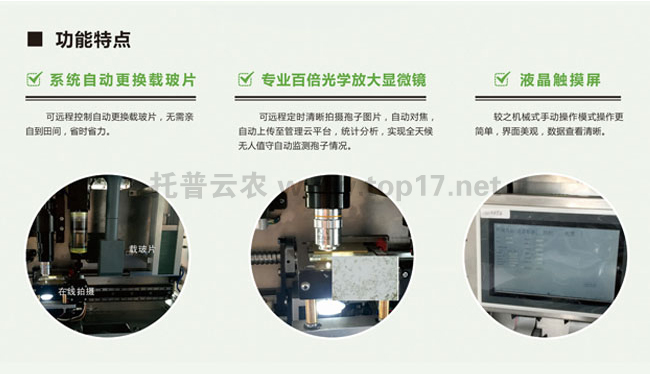 主要用于監(jiān)測(cè)病害孢子存量及其擴(kuò)散動(dòng)態(tài),實(shí)現(xiàn)全天候無(wú)人值守,實(shí)時(shí)采集分析監(jiān)測(cè)孢子情況。儀器內(nèi)置高倍光學(xué)顯微成像系統(tǒng),可定時(shí)清晰拍攝孢子圖片,遠(yuǎn)程自動(dòng)上傳至管理平臺(tái),為預(yù)測(cè)和預(yù)防病害流行、傳染提供可靠數(shù)據(jù)。儀器可固定在測(cè)報(bào)區(qū)域內(nèi),定點(diǎn)觀察特定區(qū)域孢子種類(lèi)及數(shù)量。